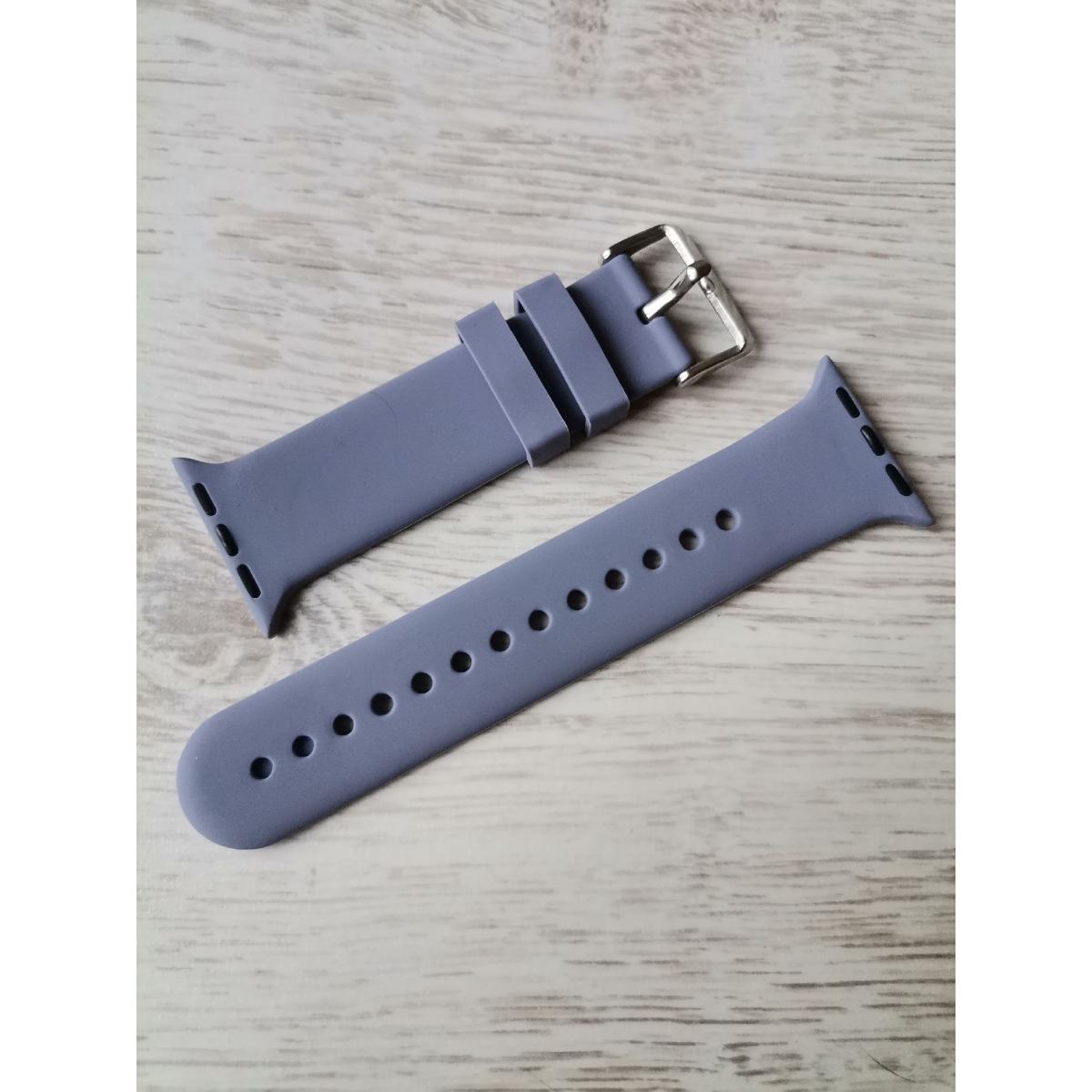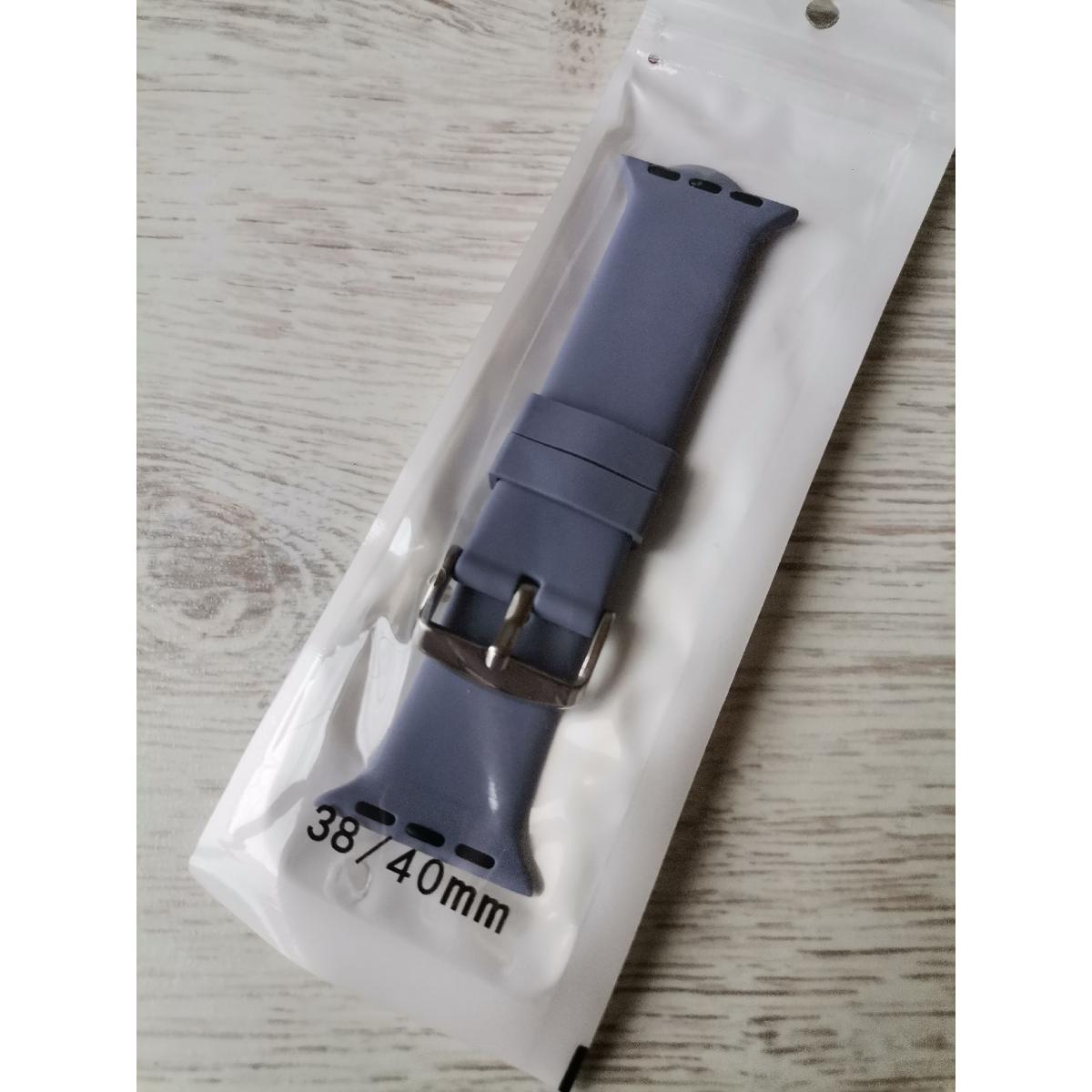 Ремешок для смарт часов Apple Watch выполнен из мягкого силикона. Цвет сине-серый, поверхность бархатистая, застежка металлическая. Подходит для часов с размером для ремешка 38/40 мм.